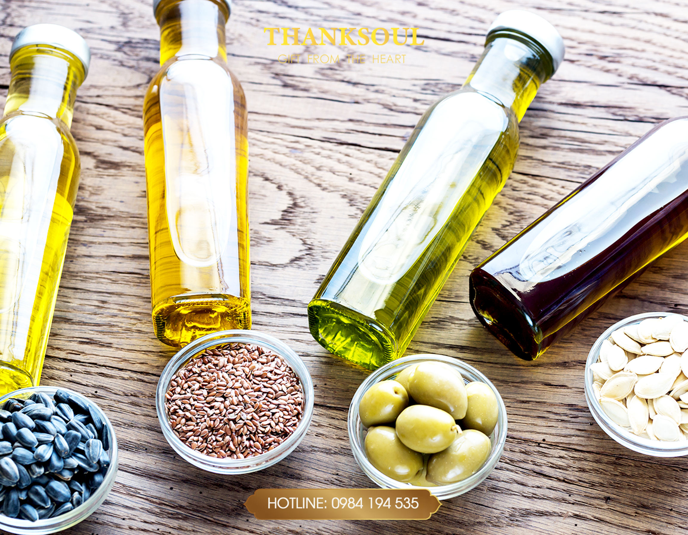 Dầu mè, dầu olive, dầu hạt lanh hoặc dầu dừa nguyên chất là những sản phẩm thiết thực cho gian bếp của người ăn chay. Món quà này vừa có giá trị sử dụng cao vừa mang ý nghĩa chăm sóc sức khỏe.