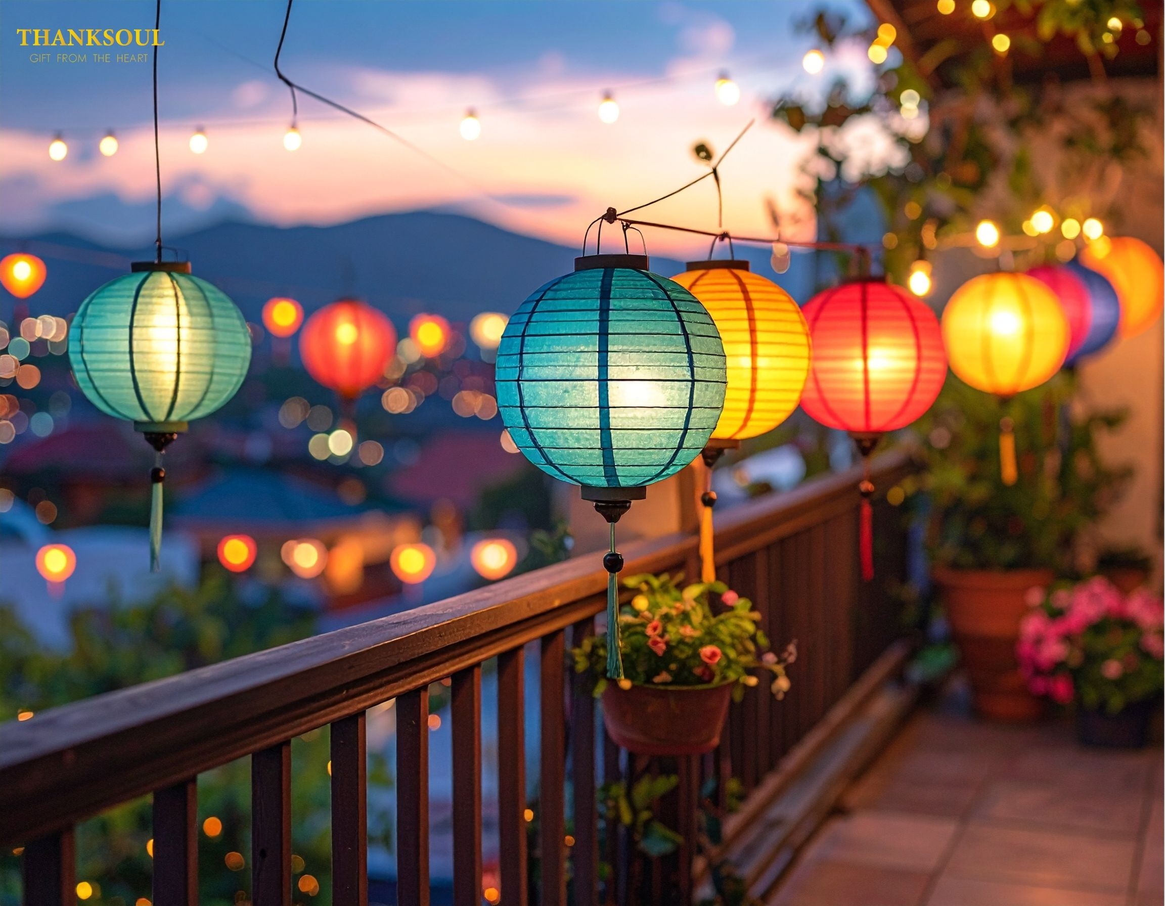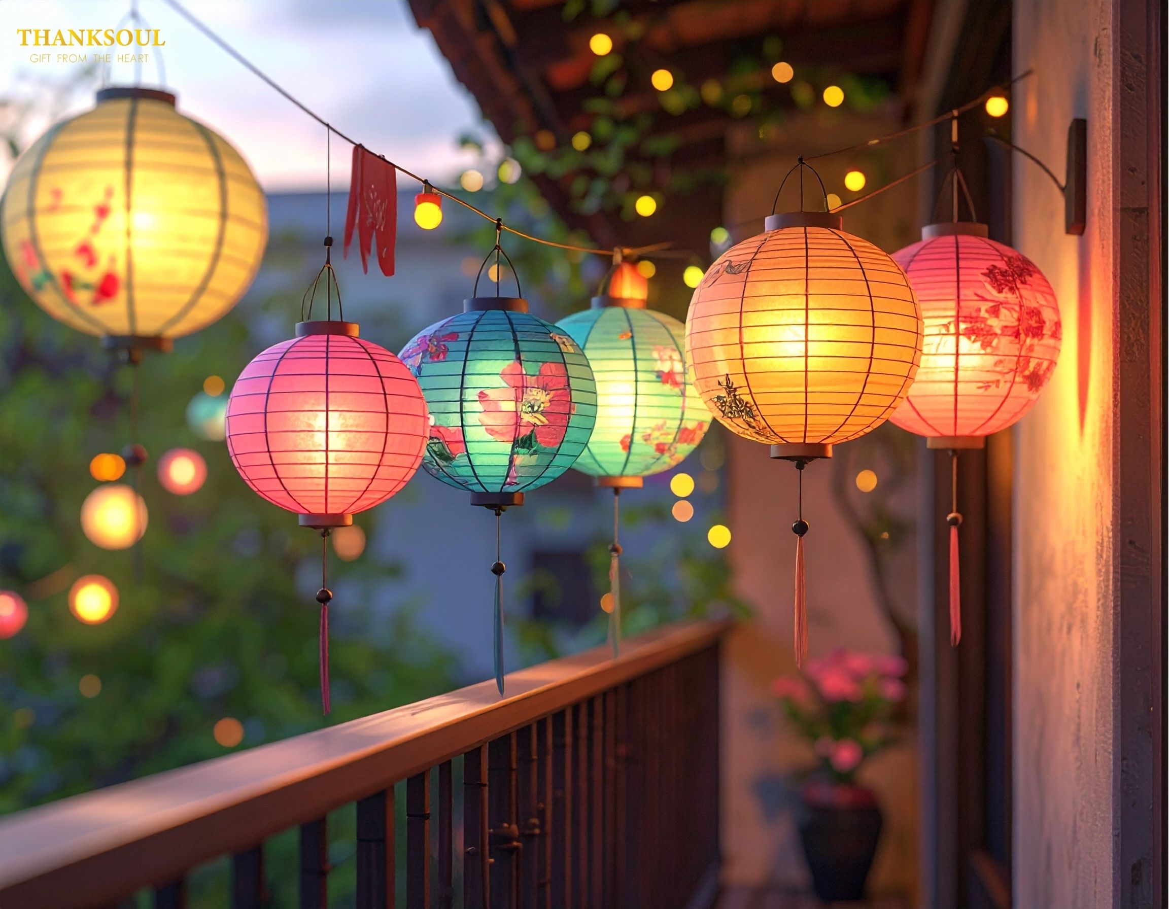 • Ban công, hiên nhà treo đèn lồng giấy hoặc nhựa nhẹ: Dễ treo, chịu được thời tiết và tạo vẻ đẹp lung linh về đêm.
