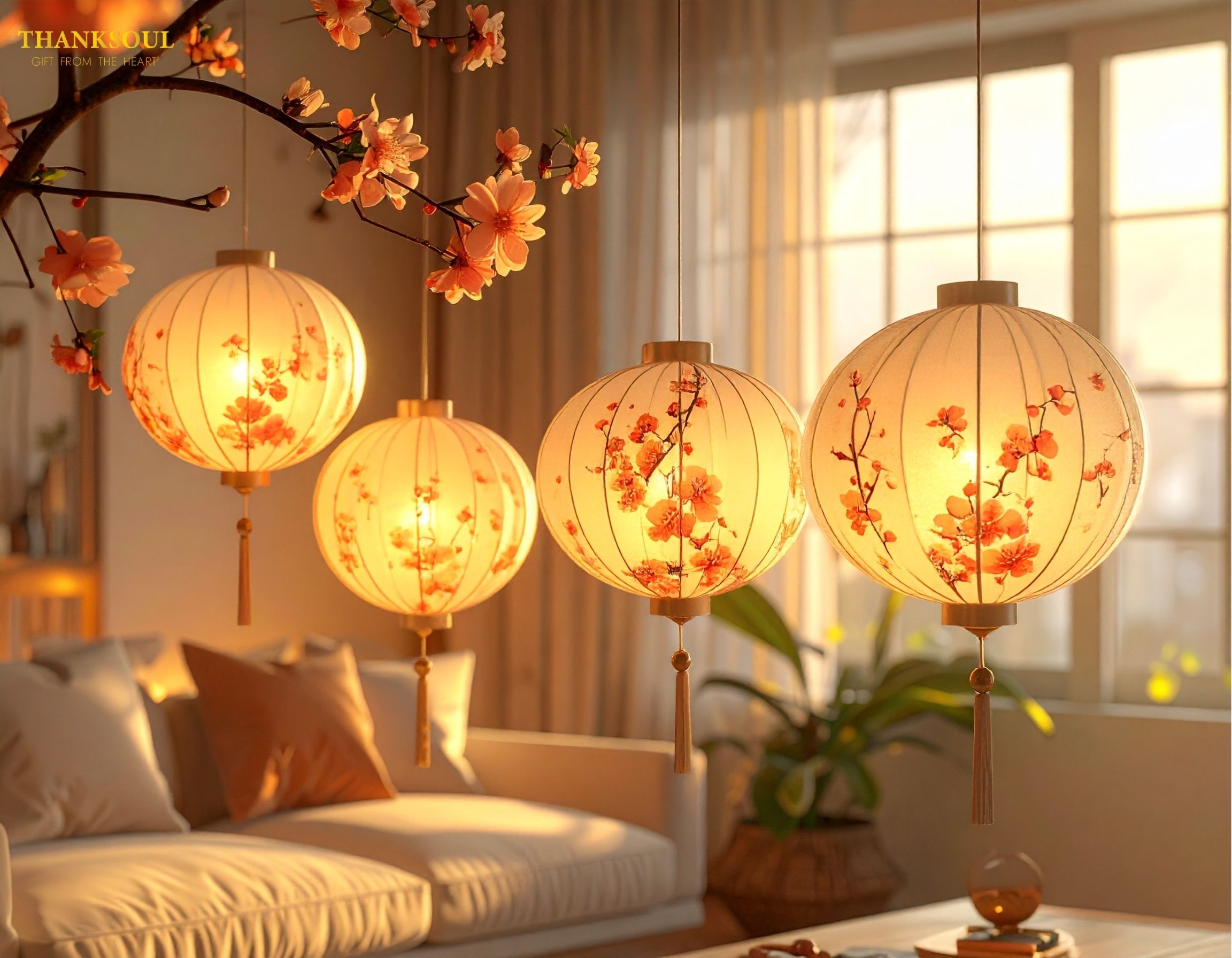 • Phòng khách treo đèn lồng trang trí nhẹ nhàng: Kiểu lồng vải lụa, họa tiết hoa mai, hoa đào, chữ Phúc tạo điểm nhấn tinh tế.